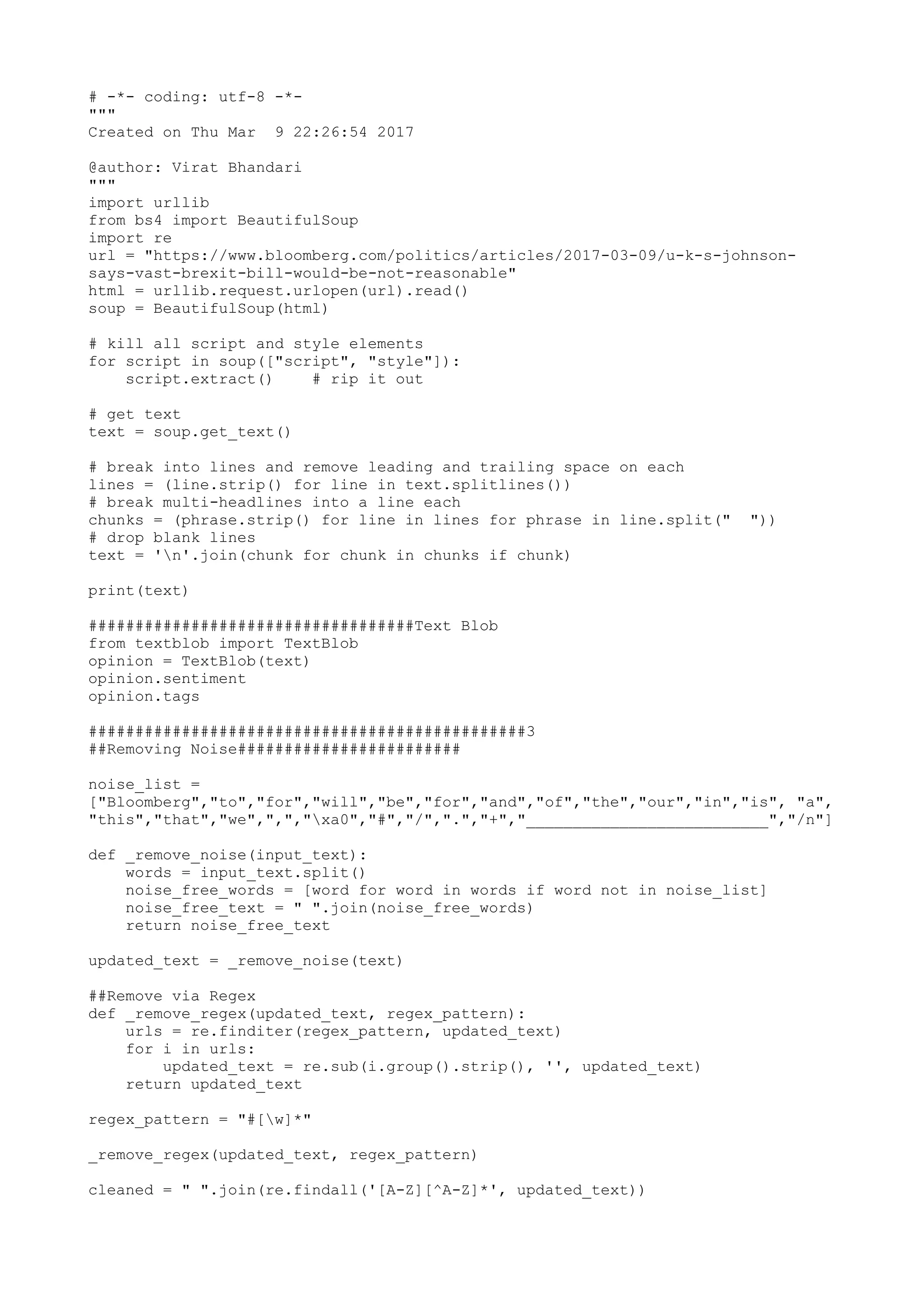 This document performs various natural language processing and text analysis techniques on a news article text such as sentiment analysis, part-of-speech tagging, topic modeling using LDA, text summarization, text classification using naive bayes, text similarity measures like Levenshtein distance and cosine similarity. It cleans the text by removing HTML tags and formatting, performs word stemming and lemmatization. It also calculates various readability statistics of the text.
