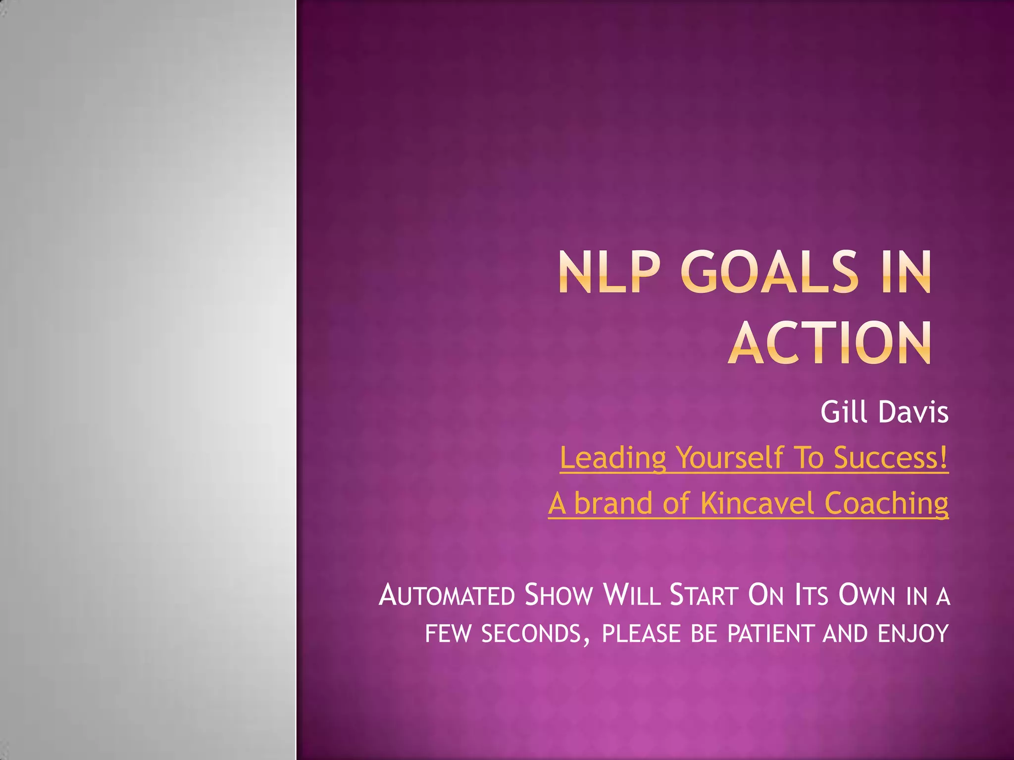 This document discusses goal setting using principles from neuro-linguistic programming (NLP). It defines goals as positive statements of intent that are formed with commitment and followed through with daily action. The document outlines various types of goals and provides 12 guiding principles for effective goal setting, including making goals specific, measurable, achievable, and time-bound. It also presents NLP tools that can be used for goal setting, such as values elicitation, the wheel of life, and well-formed outcomes. Throughout, it emphasizes visualizing goals vividly and developing action plans to achieve them.