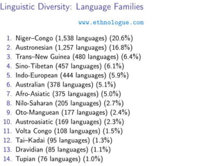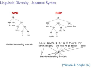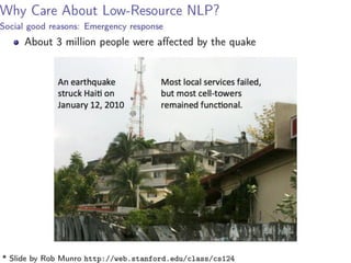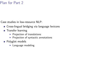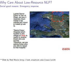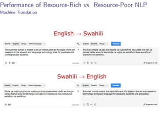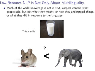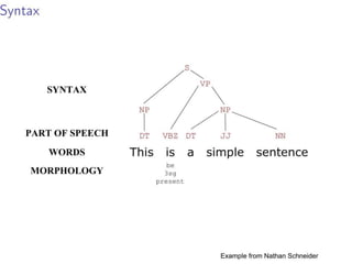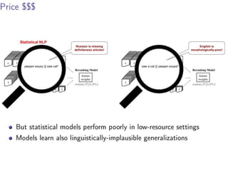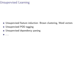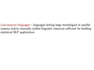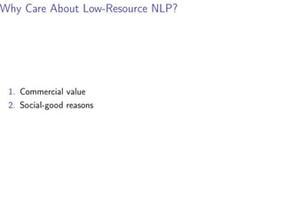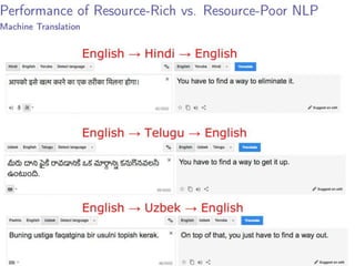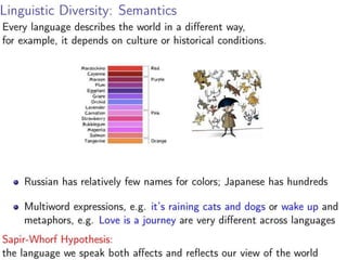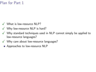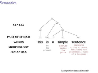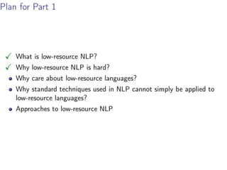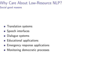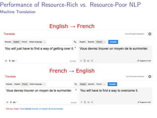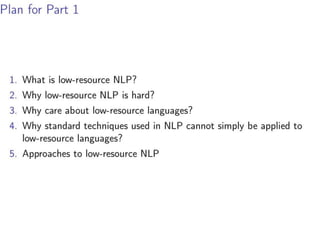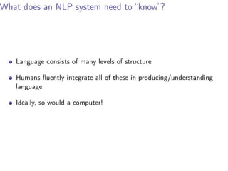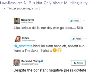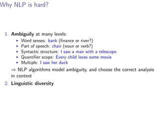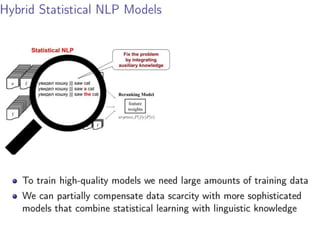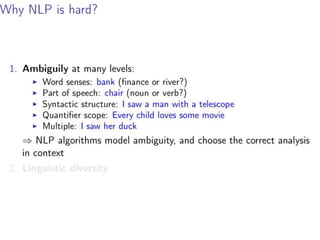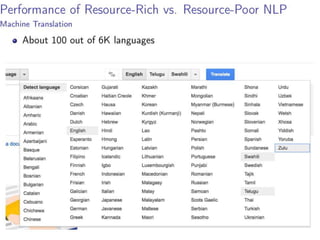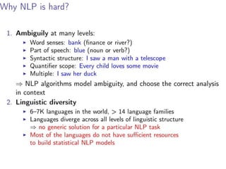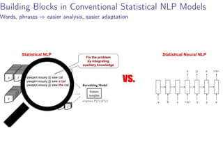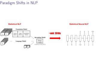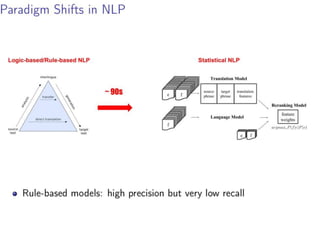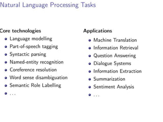 This document provides an overview of a course on trends and research applications in natural language processing (NLP). It begins with introducing the goals of the course, which are to understand interesting NLP tasks and novel projects through a research-oriented webinar. The document then covers various NLP topics like question answering, machine translation, sentiment analysis, natural language generation applications, and challenges in NLP like grounded language and embodied language. It also provides tips for aspiring NLP researchers.