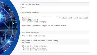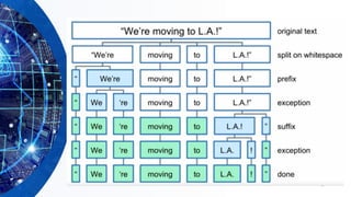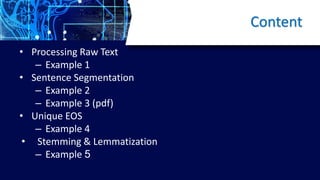 The document focuses on natural language processing (NLP) and includes examples of key concepts such as processing raw text, sentence segmentation, and unique end-of-sentence markers. It also highlights stemming and lemmatization techniques, as well as including specific examples related to NLP in the Arabic language. The document concludes with an invitation for questions.
