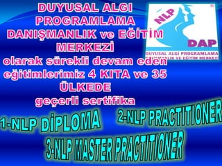 HAKKIMIZDA NLPDAP “NLPDAP farklı düşündüğü için değil, farklı bir şeyler yapmaya cesaret ettiği için başarılıdır.” ‘M.Kılınç’ NEDEN DAP? Yaşam kalitenizi artırmak, olumlu, ulaşılabilir gerçekçi, kendine ve başkalarına faydalı, iyi yapılanmış dengeli ve amaçlarının çatısını kurmuş bir birey haline gelmek ve hedefe geçmek için güç için, başarı için ve mükemmel bir sevgi için DAP…. NE DAP? “Daha nasıl mükemmel olabilirim ” dediğiniz her alanda davranışlarınızı hedeflerinizle bütünleştirmek ve sizi mükemmele, başarının hazzını yaşamaya, odaklı bir gözlem, iletişim ve kontrol merkezidir. DAP….” “İNSAN DÜŞÜNDÜĞÜ KADAR GÜÇLÜ, İNANDIĞI KADAR DEĞERLİDİR.” Bilgi beraberinde güç getirir. Güç ise sorumluluk. BİLGİ + GÜÇ = SORUMLULUK NE DAP? SORUMLULUK ÜSTLENME MERKEZİDİR. Yaşam yolculuğunuz, ancak değerlerinizi ifade ettiğiniz bir yaşama yol açtığında anlamlı bir hale gelecek. Bizim için değerli olan şeyler yaşamımızda olmayacaksa, nasıl bizim için mümkün olanın en iyisine ulaşabiliriz ki? Bizim hedefimiz kendimizi cehaletin karanlığına hapsetmek değil, gittikçe zorlaşan ve düşmanlığı arttıran bir dünyada iş arkadaşlarımız, yöneticilerimiz, dostlarımız ve komşularımızı daha iyi anlamamızı sağlayacak yolu aydınlatmaktır. İletişimin anlamı her zaman aldığınız tepkide saklıdır. İnsanlar kendilerine göre düşünürler, bize göre değil. "Bundan 20 yıl sonra yapmadıklarınızdan dolayı duymuş olduğunuz hayal kırıklığı, yaptıklarınızın verdiği hayal kırıklığından çok daha büyük olacaktır. Öyleyse zincirlerinizi kırın, halatlarınızı atın. Güvenli limandan uzaklara yelken açın. Yelkenlerinizi güçlü rüzgarlarla doldurun" Hedefinizi bilin - Eyleme geçin - Duyusal keskinliğe sahip olun - ESNEKLİK kazanın... "GÜÇ - BAŞARI VE SEVGİ İÇİN" BENİ TAKİP EDİN