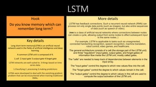 Neural networks like artificial neural networks (ANNs) and long short-term memory (LSTM) networks are commonly used in machine translation systems. ANNs mimic the human brain by recognizing relationships in vast amounts of data, similar to neural connections in the brain. The field of machine translation began in the 1950s with rule-based machine translation (RBMT) relying on linguistic rules and dictionaries. Statistical machine translation (SMT) developed in the late 1970s and analyzed existing human translations. More recently, neural machine translation (NMT) introduced in the last decade learns from each translation to improve. LSTM is a type of RNN with feedback connections that can process entire sequences of data over time and is well-suited for classifying