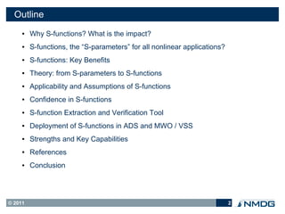 The document discusses S-functions, which are proposed as behavioral models for nonlinear components and applications, analogous to how S-parameters are used for linear components and applications. S-functions aim to simplify design and testing of nonlinear RF/microwave circuits by providing a uniform characterization approach, as S-parameters do for linear circuits. By extracting S-functions from a component, its nonlinear behavior can be modeled and its performance can be simulated, enabling more efficient system-level design and easier comparison to measurements during manufacturing testing. The document outlines benefits of the S-function approach and similarities to the established S-parameter methodology.