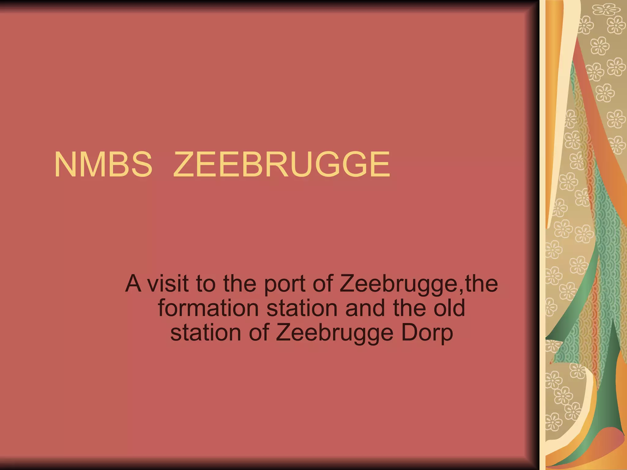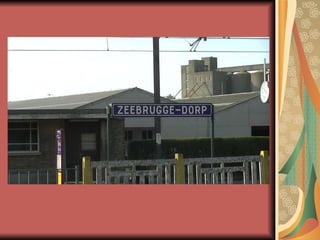 The document describes a visit to the port of Zeebrugge in Belgium, including views of the formation station where diesel locomotive series 77 performs shunting operations, the old station of Zeebrugge Dorp, and scenes around the port showing container terminals, access to the port, and a series 77 locomotive near the marina at sunset.