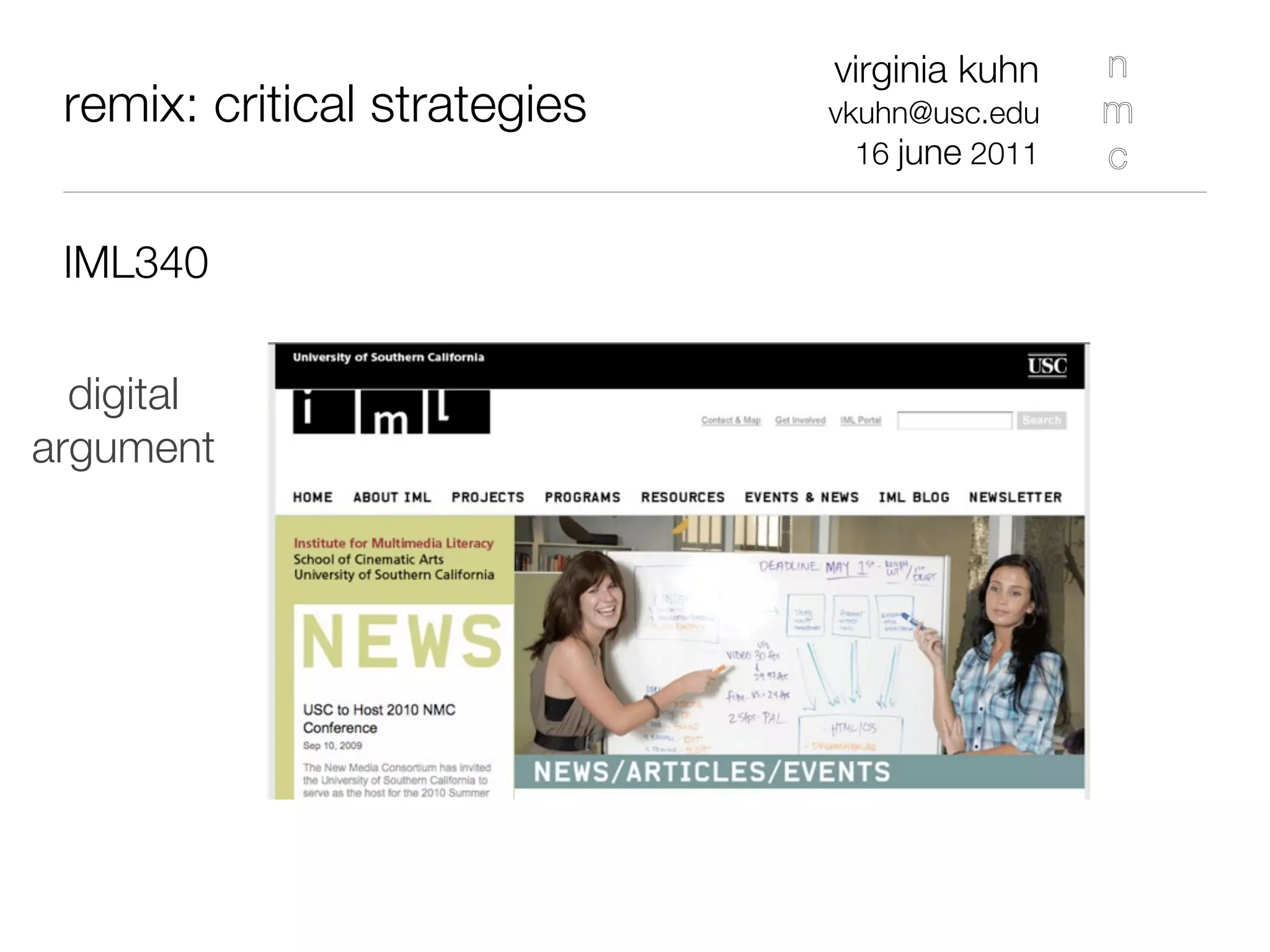 This document outlines the history and development of a course on digital remix and critical strategies from 2008 to 2011. It was authored by Virginia Kuhn and sent on June 16, 2011. The course began in 2008 focusing on history and concepts of remix culture. In 2009 it explored remixing filmic texts and analyzing examples from the emerging "fifth estate". By 2010-2011 the course examined how remix practices shape political discourse and citizen journalism.