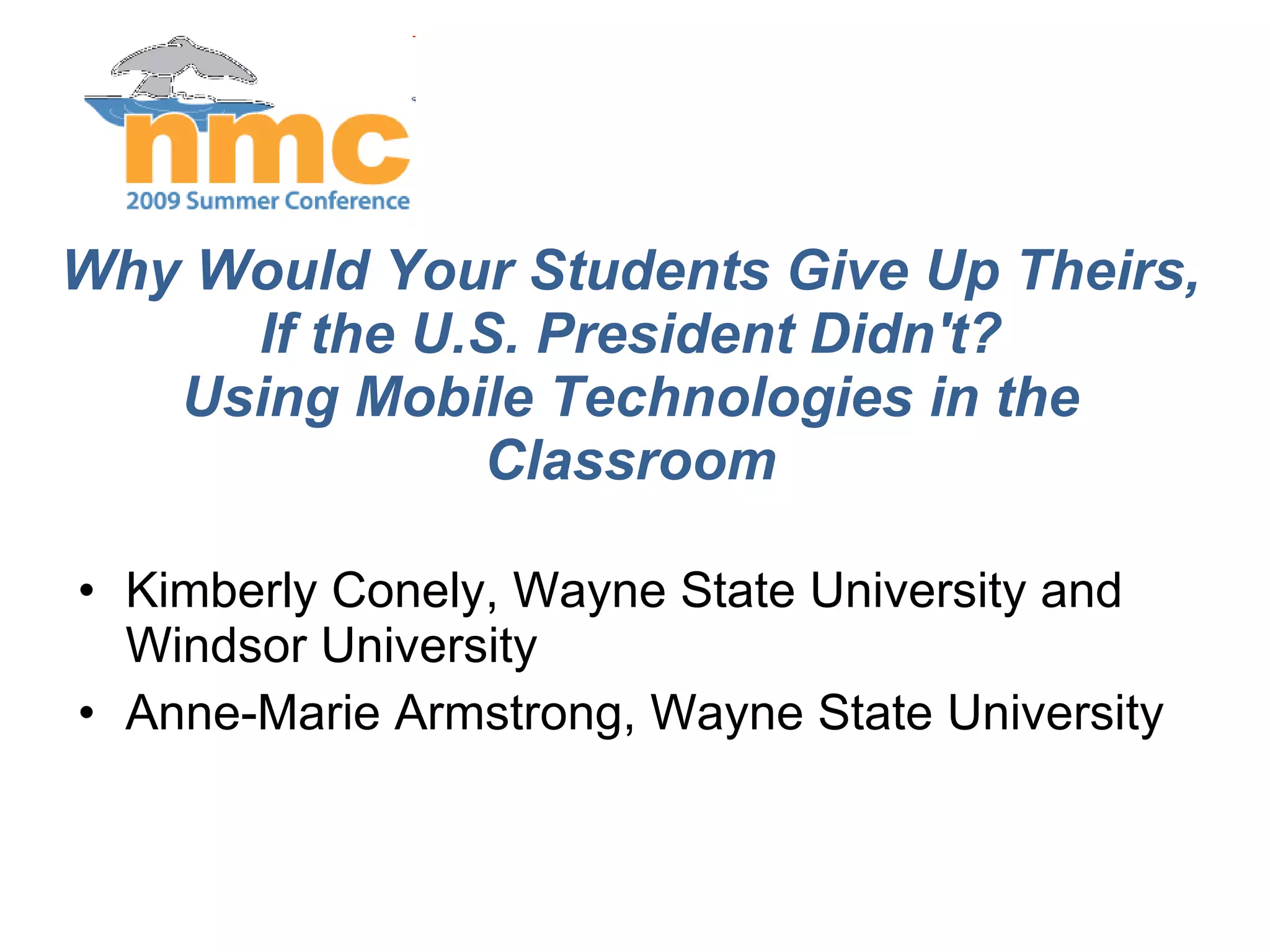 The document discusses using mobile technologies in the classroom and for learning. It defines mobile learning (m-learning) as using devices like PDAs, tablets, and cellphones to deliver modularized information and learning objects anywhere and anytime. Some benefits mentioned include extending learning outside the classroom, linking people and places, and supporting lifelong learning through just-in-time access to resources. Examples provided include mobile wikis, historical tours, citizen activism, and collecting real-time data. The document also discusses how different mobile devices and apps can support various learning theories and styles.