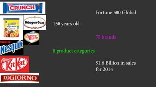 Nestlé is a 150 year old Fortune 500 company with over 75 brands across 8 categories that generated $91.6 billion in sales in 2014. To help more women identify with its corporate brand, Nestlé plans to launch a #NestleWoman marketing campaign on TV and social media highlighting the stories of women like 30 year old mother of two Kathryn who enjoys chocolate after work and showing how over 80% of responders recognize at least 6 Nestlé product lines which has led to over a 5% increase in overall sales.