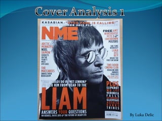 The document analyzes the design elements of a magazine cover, including its use of color, fonts, images, and layout to guide the reader's eye flow. Key elements like the masthead, coverlines, and central image of Liam Gallagher are meant to attract attention and tease the magazine's content. Black and white is used for the central image to make the red text pop out, conveying a vintage rock aesthetic that references John Lennon and suggests Gallagher will achieve similar fame and status.