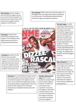 This document analyzes the layout and design elements of a magazine cover featuring British rapper Dizzie Rascal. Key elements discussed include the prominent red masthead labeling the magazine title, a central full-width image of Dizzie Rascal that matches the main cover line, and additional text in various areas that advertise other content inside the magazine aimed at appealing to its target young audience.