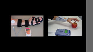 This document discusses neuromuscular electrical stimulation (NMES). It states that NMES uses electrical currents to modify neuromuscular activity and can be used to improve muscle strength, increase range of motion, reduce edema, decrease atrophy, heal tissue, and decrease pain. The document discusses optimal stimulation parameters, noting that higher frequencies between 30-100 Hz are typically used for NMES, and that ramp up/down times of 1-3 seconds and pulse widths of 300-600 microseconds are common. It also notes the importance of amplitude/intensity and that lower intensities can induce more central nervous system input than higher intensities.