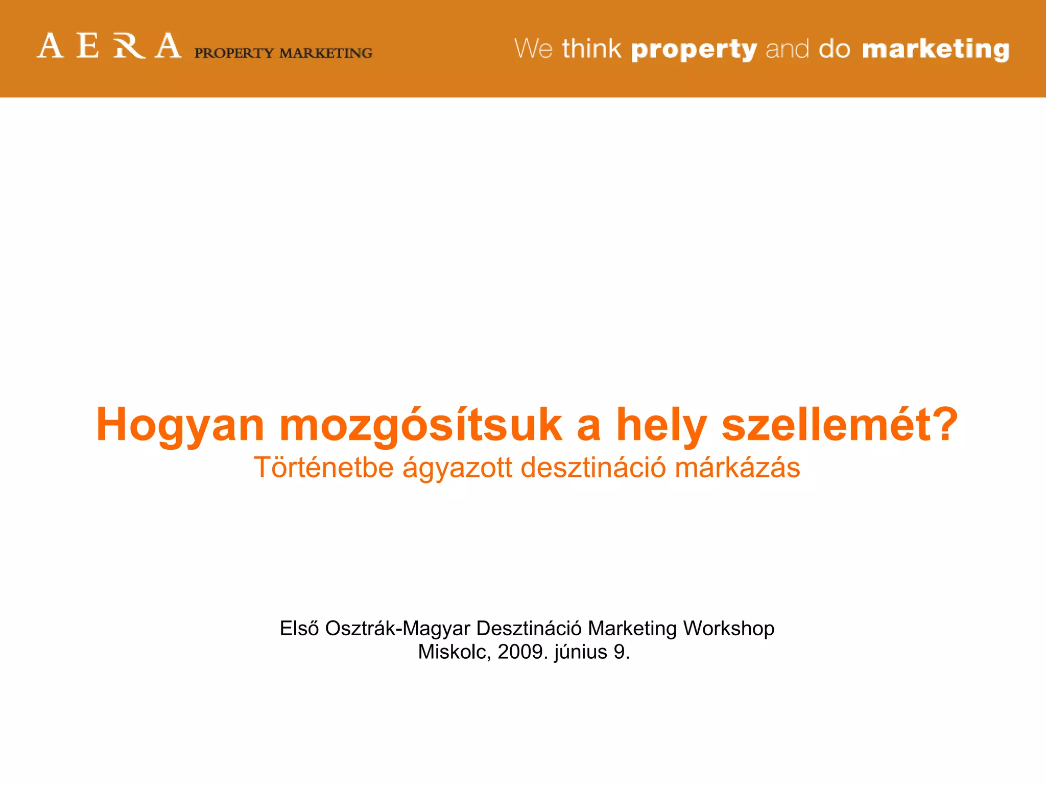 Mi a desztinációmárka? A desztináció márka több mint egy logó+szlogen : Kulcs ahhoz, hogy megtudjuk, miről szól a desztináció Megtestesíti a a fogyasztóknak (befektetőknek, üzleteknek, intézményeknek, lakóknak, diákoknak és látogatóknak) nyújtott értékeket és élményt Kapocs: A sikeres desztináció márka egy beteljesülése váró ígéret , mely összeköti a desztináció által kínált élményt és az ott élő, dolgozó, befektető és oda látogató embereket. A sikeres desztinációk / a desztináció márkák jellemzői: Jól ismert Könnyen beazonosítható Versenytársaitól egyértelműen különbözik Célcsoportjai számára világos és releváns vonzerőt / élményt kínál