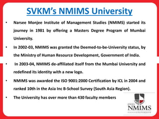 SVKM's NMIMS University started in 1981 and was granted deemed university status in 2002. It has campuses across India and over 430 faculty members. NMIMS Global Access School for Continuing Education (NGA-SCE), a distance education division, started in 1994 and offers PG Diplomas, Diplomas, and Certificates in management. Programs are approved by UGC-DEC and use an online learning model with lectures, personal contact sessions, and self-study materials. Fees vary by program length from 6 months to 2 years. Exams have internal assignments and end-term components, with a minimum 50% passing score required.