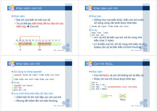 Tài liệu trình bày về các khái niệm cơ bản về con trỏ trong lập trình C, bao gồm cách khai báo, sử dụng và các phương pháp truyền đối số cho hàm. Nó cũng đề cập đến mối quan hệ giữa con trỏ và mảng, cấu trúc, cũng như các phép toán trên con trỏ. Các ví dụ minh họa cụ thể giúp làm rõ từng khái niệm kỹ thuật liên quan.