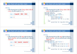 Tài liệu giới thiệu về lập trình hàm nâng cao, bao gồm các khái niệm như tham số hàm main, đối số mặc định, hàm nội tuyến, và hàm trả về tham chiếu. Các ví dụ cụ thể giúp người đọc hiểu cách truyền đối số, sử dụng hàm với mặc định và tạo hàm nội tuyến. Cuối cùng, tài liệu cung cấp một số bài tập thực hành để củng cố kiến thức.