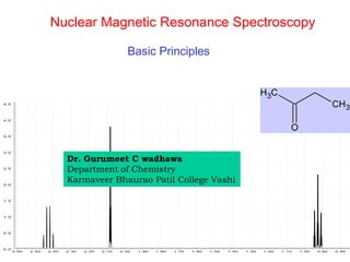 1. The document discusses the basic principles of Nuclear Magnetic Resonance (NMR) spectroscopy. It explains how certain nuclei can have spin and magnetic moments, and how these nuclei absorb electromagnetic radiation in the radiofrequency region when in a strong magnetic field.