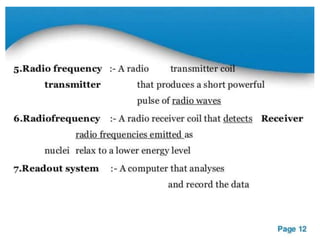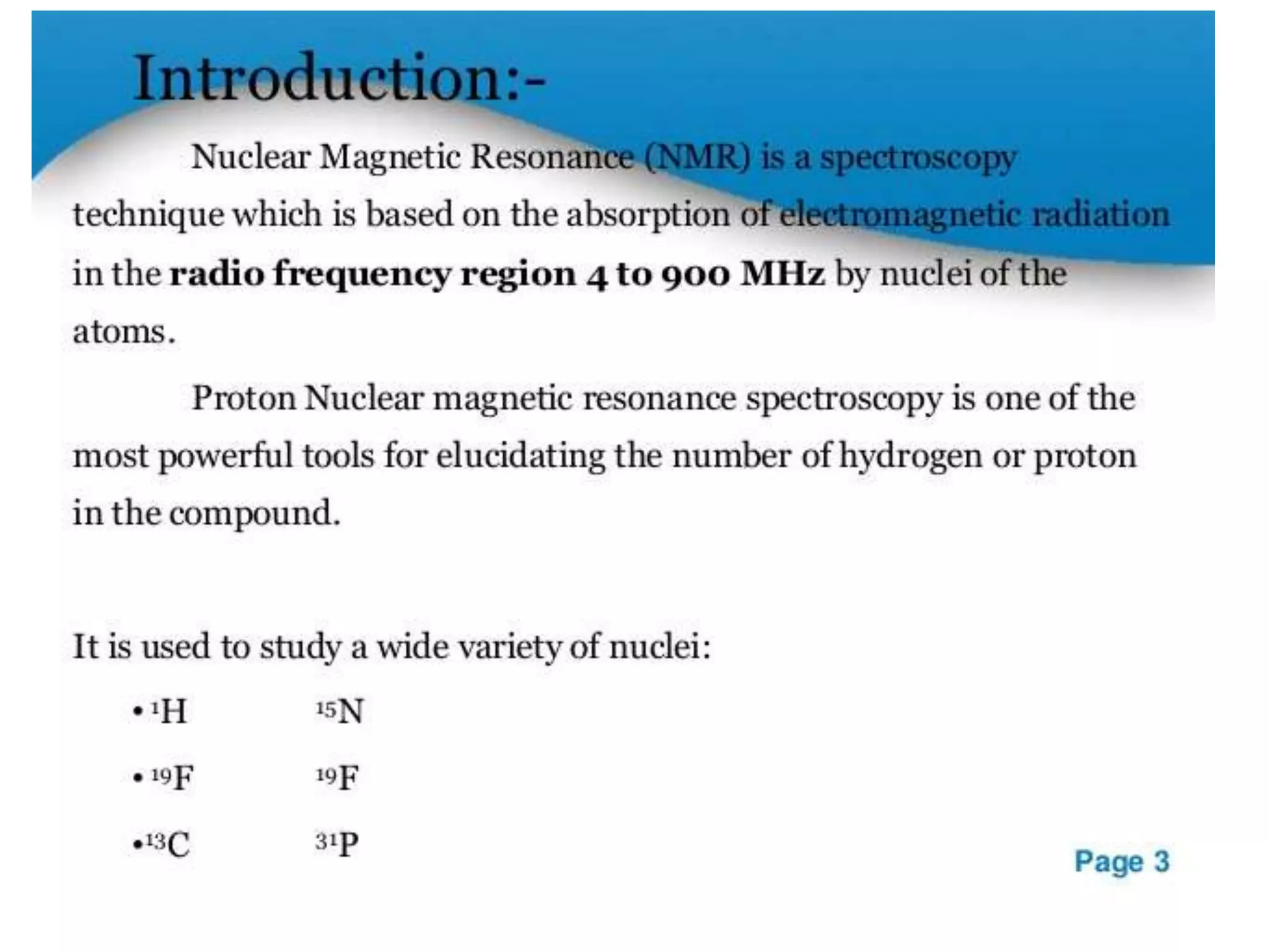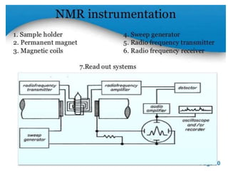 Nuclear magnetic resonance (NMR) spectroscopy uses radio waves to analyze organic molecules by determining their carbon-hydrogen frameworks. There are two main types of NMR: 1H NMR identifies hydrogen atoms and 13C NMR identifies carbon atom types. NMR works by placing the molecule in a strong magnetic field, which causes the nuclear spins of some elements to change orientations. When a matching radio wave is applied, energy is absorbed and the nucleus "spin flips" between energy states. The frequency at which this occurs depends on the molecule's electronic environment. NMR spectra plot peak intensity against chemical shift in parts per million to reveal structural information.