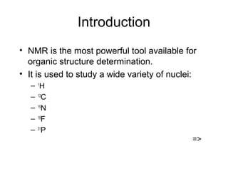 Nuclear Magnetic Resonance Spectroscopy (NMR) is a powerful tool for determining organic structures. NMR uses radio waves to analyze atomic nuclei like 1H, 13C, 15N and 19F in a magnetic field. NMR provides information on a molecule's functional groups, bonding types, and stereochemistry. Signals correspond to different nuclear environments and splitting patterns reveal molecular connectivity. Fourier transform NMR techniques and carbon-13 detection allow more detailed structural analysis. Magnetic resonance imaging (MRI) applies similar principles for noninvasive medical imaging.