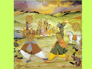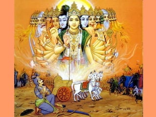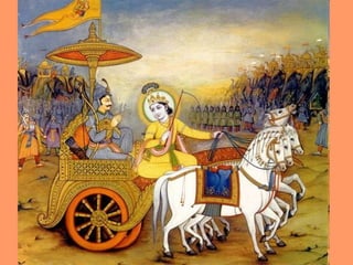 The document discusses key concepts from the Bhagavad Gita. It advises not to worry about the past or future, as the present moment is all that exists. It notes that one comes into the world with nothing and will leave with nothing, so there is no reason to be attached to material possessions or outcomes, as they are all temporary. It counsels that dedicating one's actions to God is the path to freedom from fear, worry and sorrow.