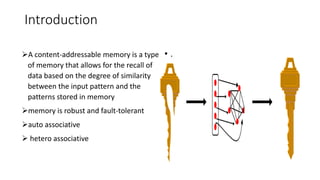 The document compares the performance of an autoassociative memory with and without using a pseudoinverse weight matrix. It finds that using the pseudoinverse weight matrix improves performance in both noise-free conditions and when noise is present. Specifically, it finds that without the pseudoinverse, the weight matrix has a larger range of values and more cross-correlation, resulting in more character errors. With the pseudoinverse, the weight matrix range is limited to 0 to 1, improving performance both without and with noise. The autoassociative memory using the pseudoinverse weight matrix thus demonstrates much better performance.