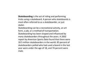 Skateboarding originated in California in the late 1940s when surfers wanted something to do on flat days. It grew in popularity in the 1970s with the development of polyurethane wheels and trucks designed for skateboards, allowing for more maneuverability. A key development was the invention of the ollie in 1976 by Alan Gelfand, which allowed skaters to do tricks in mid-air and transformed skateboarding with the adaptation of tricks to flat ground, led by skater Rodney Mullen.