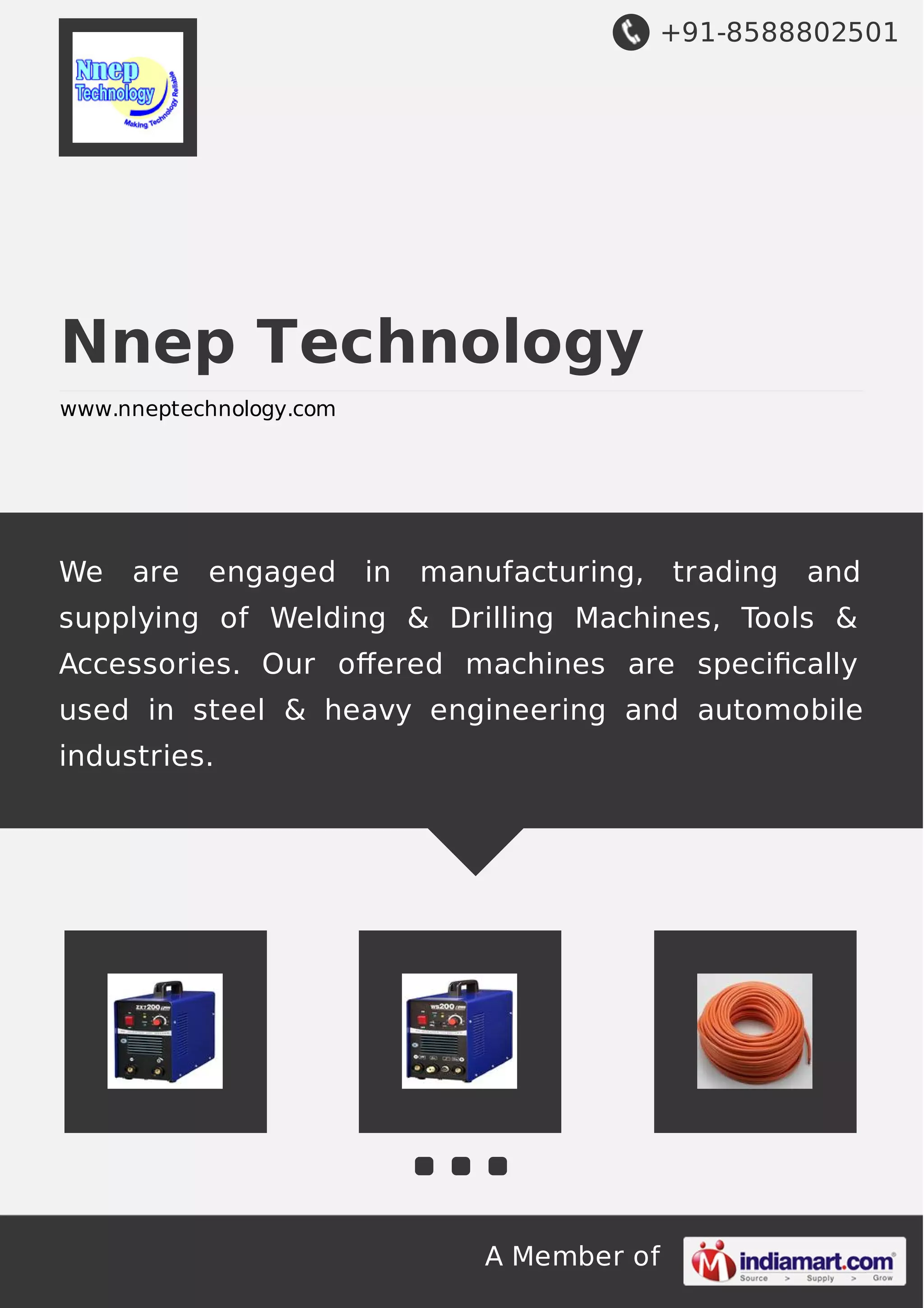 Nnep Technology manufactures and supplies welding and drilling machines and accessories. It was established in 2009 and produces ARC welding machines, MIG welding machines, and other industrial tools for sectors like automotive and steel. The company has a modern infrastructure and sources raw materials from trusted vendors to produce high quality machinery. It aims to satisfy customers and has experienced growth due to its dynamic team and strong production capabilities.