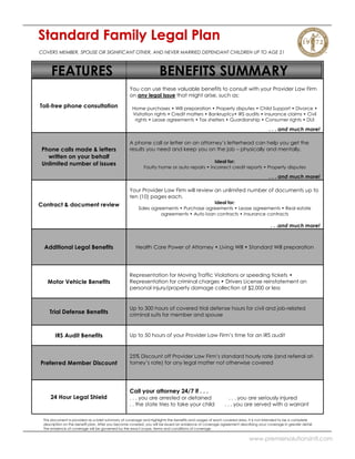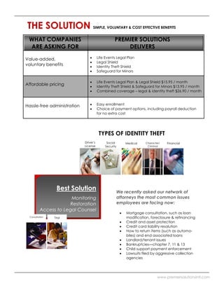 This document summarizes voluntary benefits that provide legal services and identity theft protection. It offers affordable monthly plans for legal services covering legal advice, document review, trial defense, and IRS audit assistance. An identity theft plan provides credit monitoring, identity restoration services, and fraud resolution assistance. Both plans have easy enrollment options and cover employees, spouses, and dependents. The plans aim to provide simple, valuable benefits to address common legal and identity theft issues.