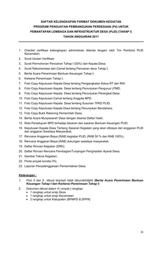 Dokumen tersebut berisi pedoman pengelolaan program penguatan pembangunan perdesaan (P4) untuk pemantapan lembaga dan infrastruktur desa (PLID) di Kabupaten Bandung, termasuk format dokumen kegiatan, daftar kelengkapan persyaratan, dan contoh surat permohonan pencairan dana tahap pertama.