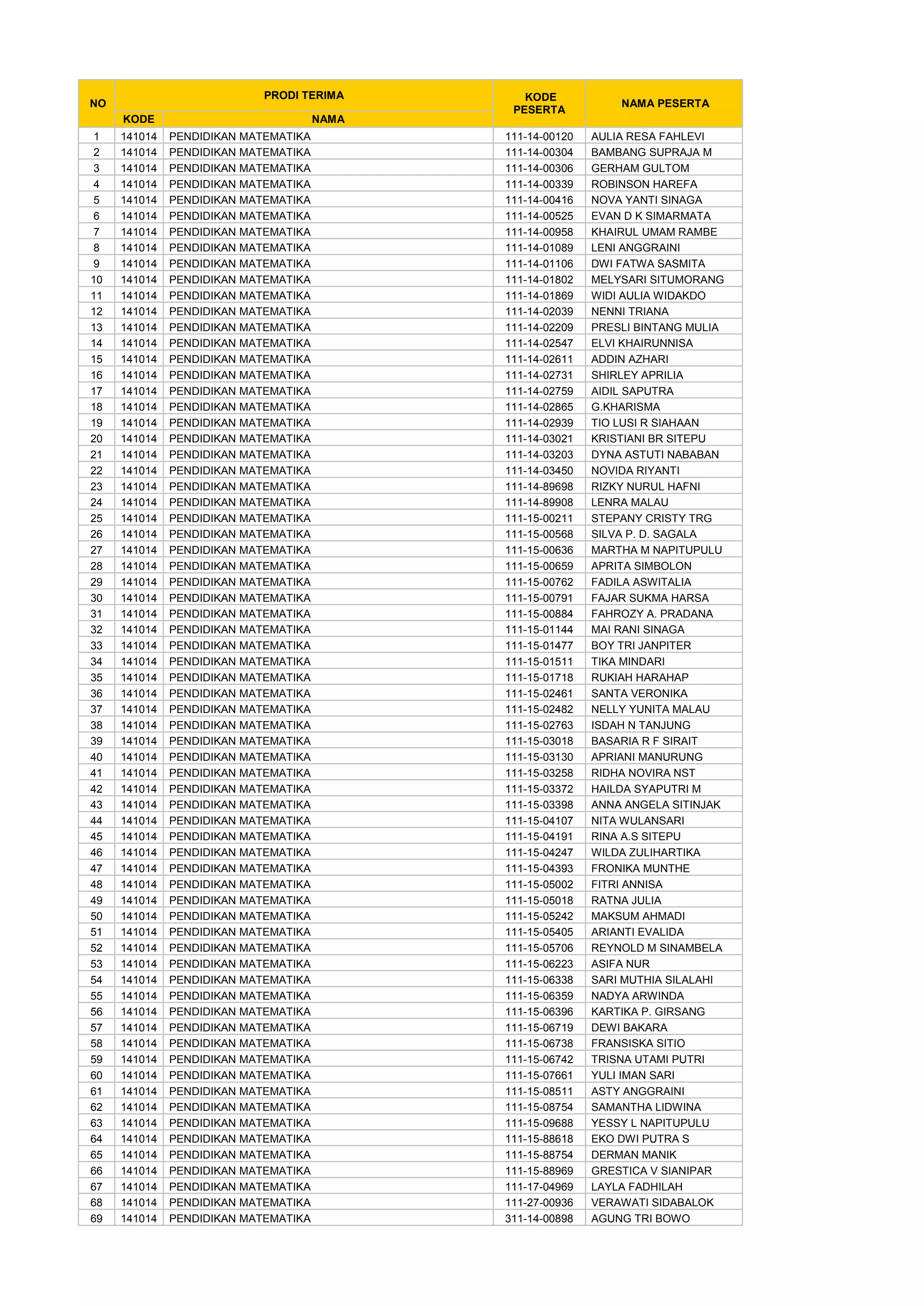 Dokumen berisi daftar nama peserta prodi Pendidikan Matematika dan Pendidikan Biologi beserta kode masing-masing. Terdapat 69 peserta Pendidikan Matematika dan 116 peserta Pendidikan Biologi dengan informasi kode prodi, kode peserta, dan nama peserta.