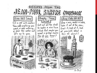 Sartre's play No Exit explores existentialist themes of free will, responsibility, and human relationships. It tells the story of three deceased characters - Joseph Garcin, Inez Serrano, and Estelle Rigault - who find themselves trapped together in a room in Hell. They realize that their eternal punishment is being forced to interact with and depend on each other for companionship, with no way to exit the room. The characters represent different ways of living in "bad faith" by denying personal responsibility through excuses or living in denial.
