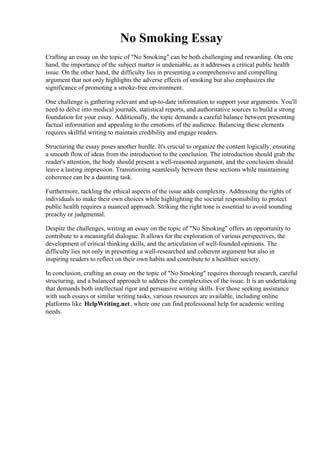 Writing an essay on 'no smoking' presents both challenges and rewards, as it addresses a significant public health issue while requiring a balance of factual information and emotional appeal. Writers must carefully organize their essays, ensure coherent transitions, and navigate the ethical implications of individual choices versus societal responsibilities. Ultimately, this task encourages critical thinking and engagement with the topic to promote a healthier environment.