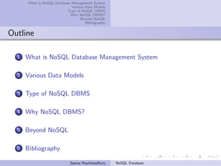 The document discusses NoSQL databases, including what NoSQL is, various data models like key-value, document, column-family and graph databases. It describes types of NoSQL databases and examples. Reasons for using NoSQL databases are provided, such as their ability to handle schema migrations easily, support multiple data formats, avoid impedance mismatch and automatically shard data across servers.