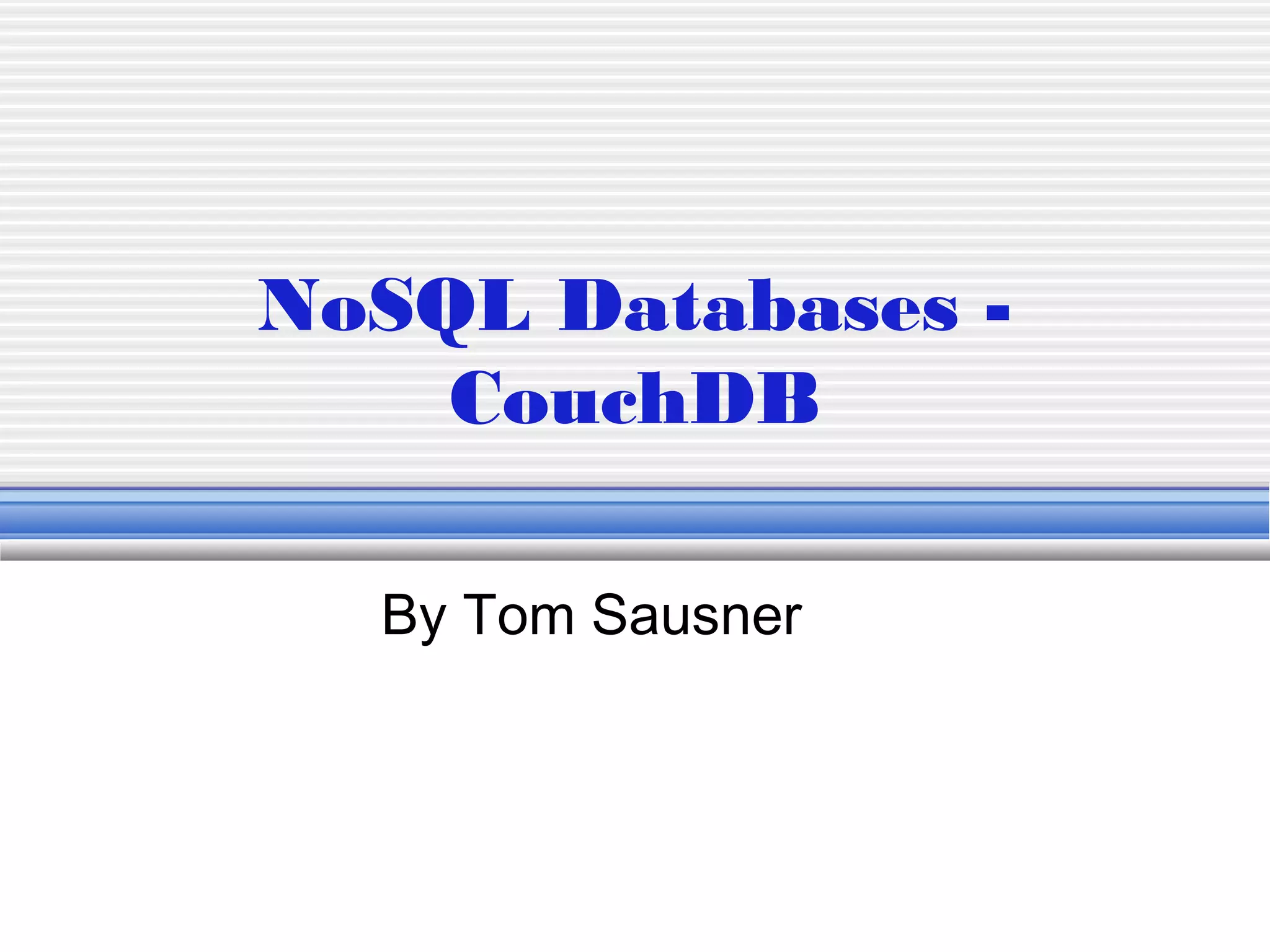 This document provides an overview of CouchDB, a NoSQL document database. It discusses key concepts like the CAP theorem and different categories of NoSQL databases. It then describes CouchDB in more detail, covering how to interact with data via REST APIs and CURL, use design documents to define views and validation, and handle data replication and conflicts. Map/reduce functions are used to query the data and build indexes.