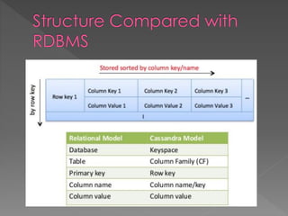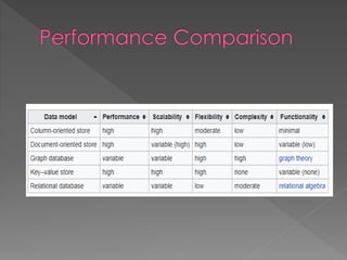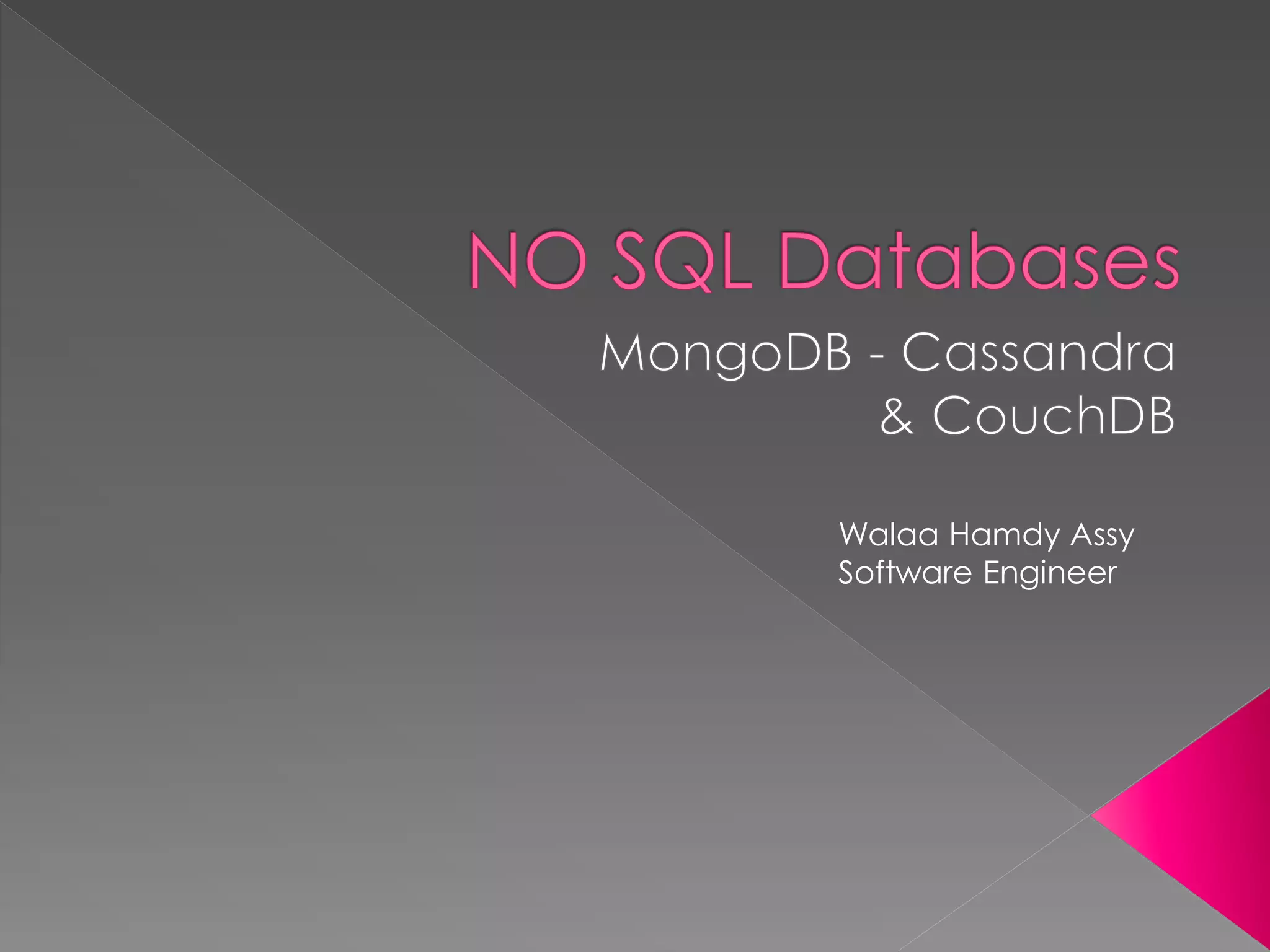 NoSQL databases, which emerged in the late 1960s and gained popularity with web 2.0 companies, offer diverse data models like document, key-value, and column families, providing flexibility, scalability, and higher performance compared to traditional relational databases. Famous NoSQL systems include MongoDB, CouchDB, and Cassandra, each suited for various applications, from big data to real-time analytics, while employing different architectures and query methods. NoSQL databases are particularly advantageous for applications requiring high availability and fault tolerance, with examples of use in large organizations such as Facebook, Twitter, and eBay.
