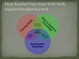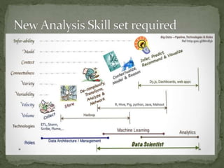 The document discusses big data and its key characteristics known as the 5Vs: volume, velocity, variety, variability, and value. It provides examples of how different companies and industries deal with large volumes of data from various sources in real-time. Big data technologies like Hadoop, HDFS, MapReduce, Cassandra, and MongoDB are helping companies analyze and gain insights from both structured and unstructured data across industries like retail, finance, and social media. Data scientists use tools, techniques and programming languages to understand trends and patterns in large, complex data sets.