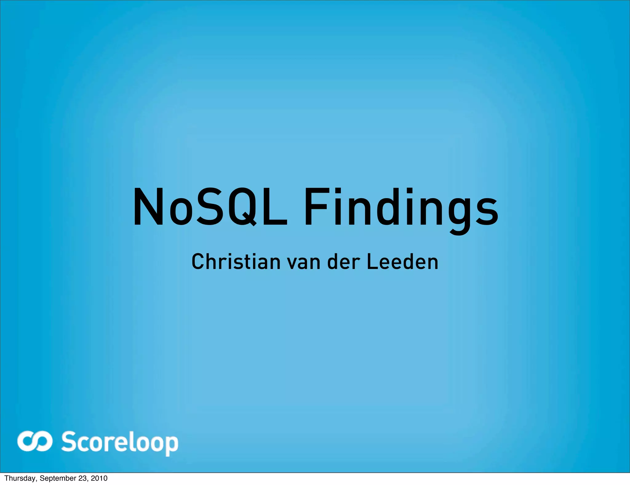 The document discusses evaluating different NoSQL databases to replace a PostgreSQL database that is expected to become a performance bottleneck due to high volume growth that is unpredictable and non-linear. It summarizes the criteria for the NoSQL solution, including the ability to scale horizontally, good performance for Ruby, and active development. Several NoSQL databases are evaluated, including MongoDB, Redis, Cassandra, HBase, and Membase. MongoDB, Redis, and Cassandra are discussed in more detail regarding experiences and performance.