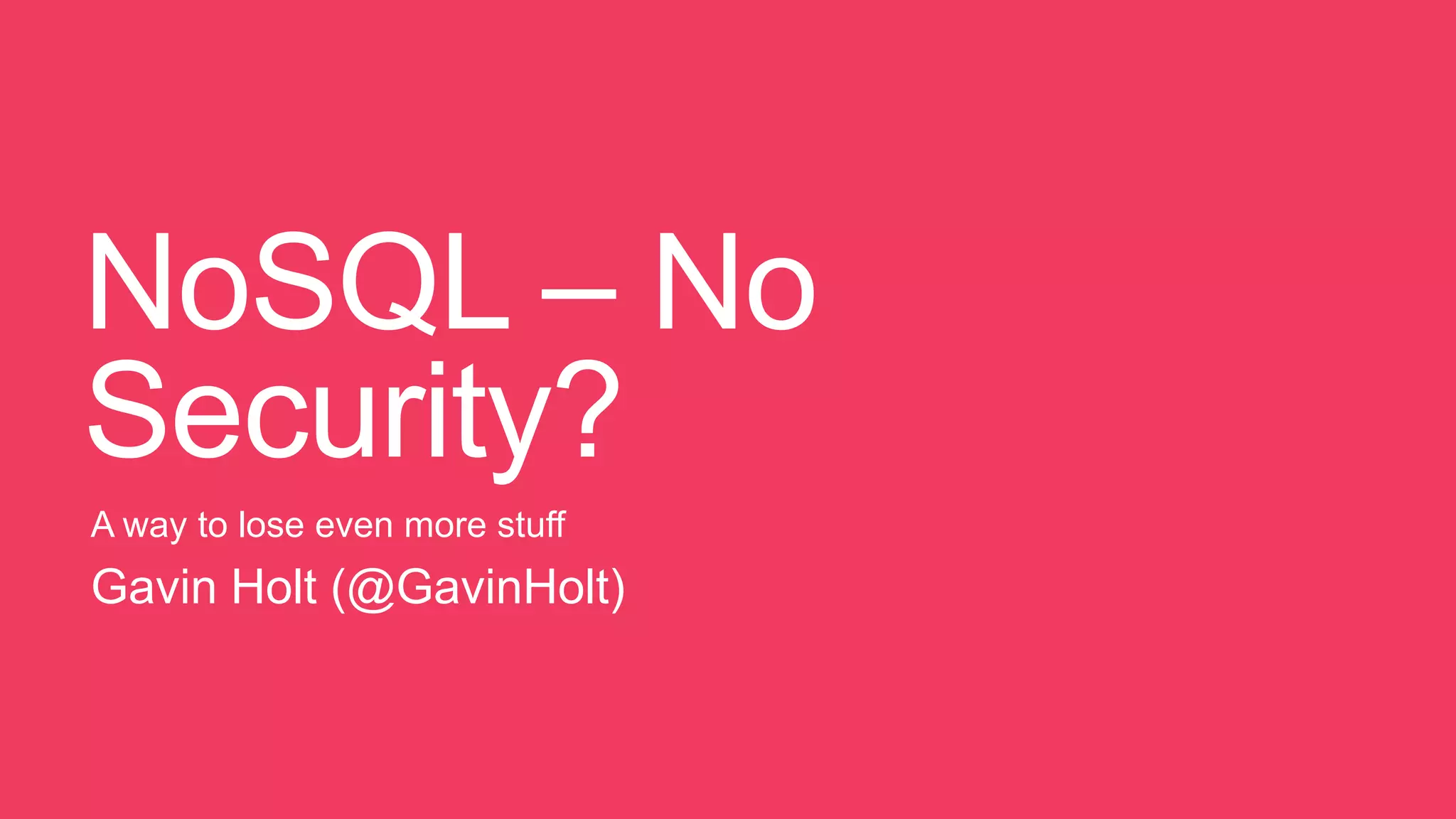 This document discusses NoSQL databases and security issues related to them. It begins by defining big data and NoSQL, noting that NoSQL is optimized for speed and size for large datasets. It then discusses some common vulnerabilities in NoSQL like lack of authentication, injection attacks, and server-side JavaScript injection. Finally, it provides recommendations for securing NoSQL installations like sanitizing inputs, controlling query building, and following standard SQL security best practices.