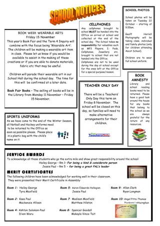 This document provides important dates and information for Ascot School families in Term 4. It announces upcoming events like the school pet show, performances, camps, and book fair. It reminds families to return uniforms and library books. It also provides school account payment details and canteen lunch options. Finally, it acknowledges students' achievements and responsible behavior.