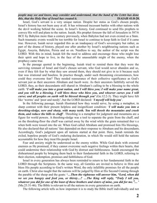 The document discusses the unique role of Israel as God's chosen servant and its historical challenges, emphasizing that despite adversities, God promises support and intervention. It encourages believers to maintain faith in God's plan and highlights the importance of studying the Bible personally to develop a balanced understanding of God's covenants and end times. The document also notes the migration patterns of Jews to Israel amidst global conflicts, contrasting their voluntary movement to Israel with the forced migration of Muslims from neighboring regions.