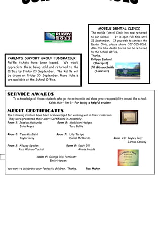 The document provides important dates and information for parents/caregivers from the school principal. Tomorrow marks the first day of spring and the start of Term 3. Upcoming events in September include a choir practice, ski trip, drama festival, and school sing-out. Selected students will meet the All Blacks in Winton. The "school skiers" will depart for a ski trip. Thank yous are given for fundraising support. Students received awards for their performance in a technology challenge. Details are provided on parent-teacher interviews, the school website, mobile dental clinic, and a parents support group fundraiser. Merit awards are announced.