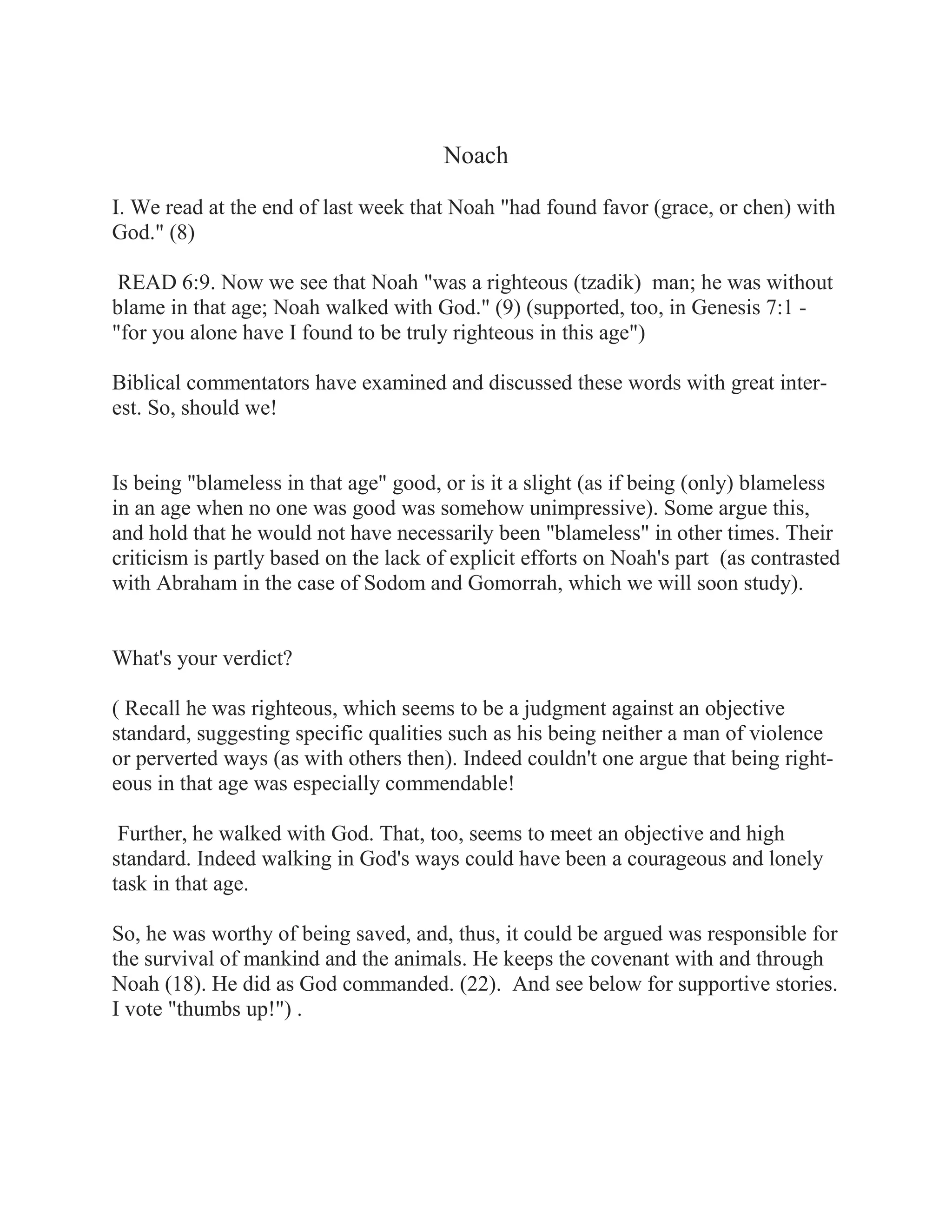 The document discusses several passages from the book of Genesis, including Noah finding favor with God for being righteous, Noah building the ark, God's covenant with Noah after the flood, and the story of the Tower of Babel. It asks questions about these passages and debates interpretations, bringing in additional context from Jewish tradition. It also discusses the genealogy from Shem to Abram/Abraham and raises the possibility that Abram's father Terah began the journey away from idolatry, not Abram alone.