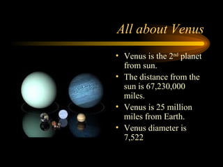 Venus is the second planet from the sun and is similar in size to Earth but has extreme temperatures, dense atmosphere and no moons. It has been explored by over 26 space missions which revealed details about its orange color, dense carbon dioxide atmosphere, lack of water or oxygen, and extensive volcanic activity making it currently uninhabitable by humans.