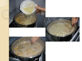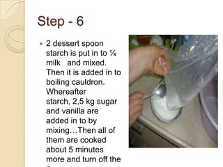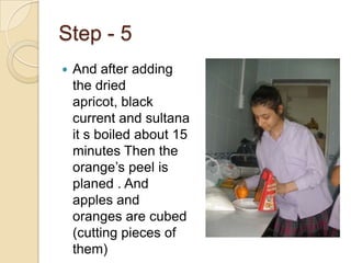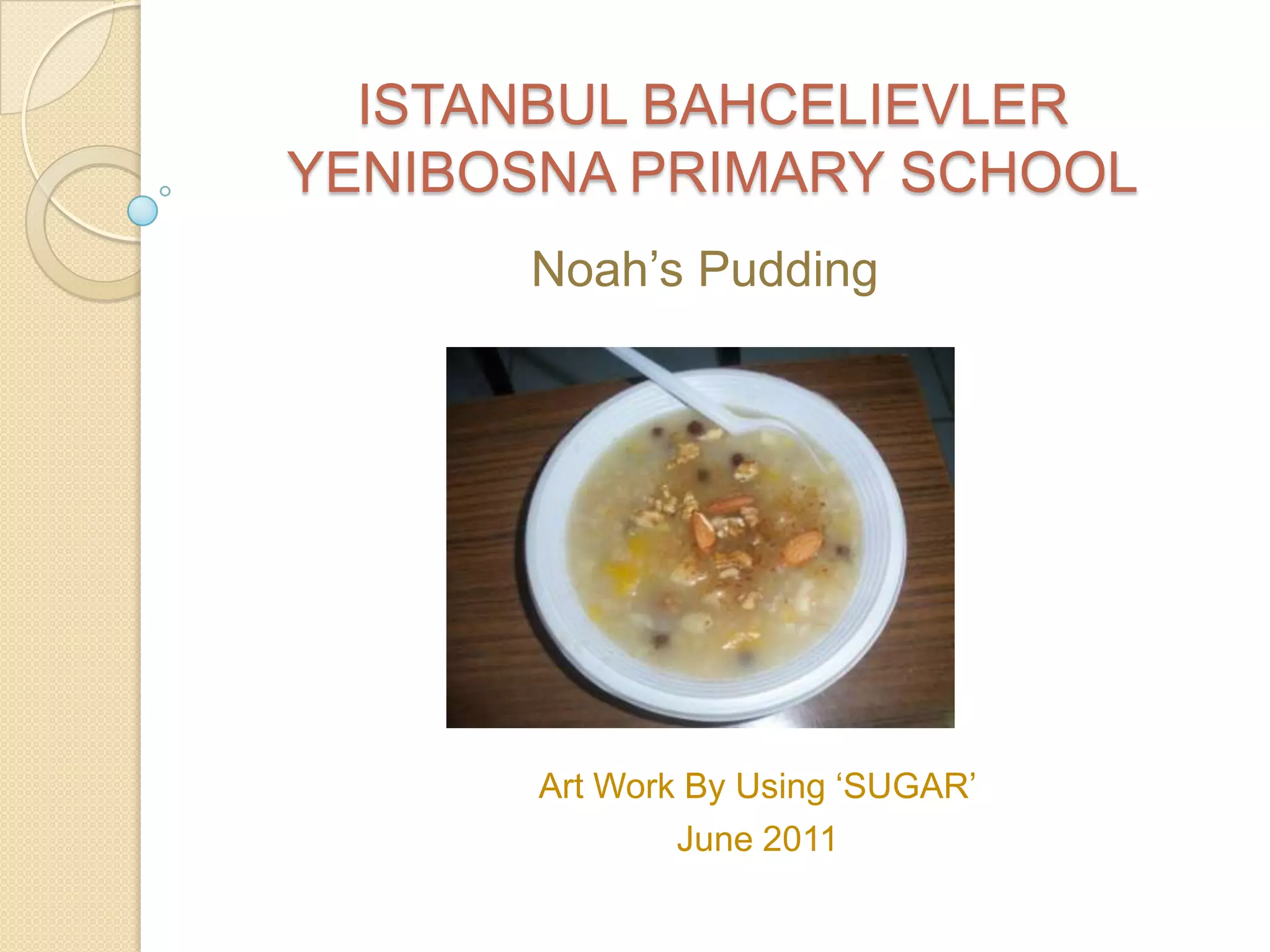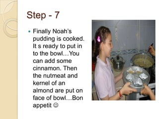 The document provides instructions for making Noah's Pudding, an Ottoman dessert. It lists the required ingredients which include wheat, beans, dried fruits, sugar, nuts, and spices. The instructions are given in 7 steps: 1) soak and boil grains and legumes, 2) boil the wheat, 3) add boiled beans to wheat, 4) soak and add dried fruits, 5) add citrus zest and fruit, 6) thicken with starch and cook further with sugar and vanilla, 7) allow to cool before serving topped with nuts.