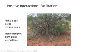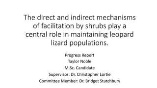 The direct and indirect mechanisms of facilitation by shrubs play a central role in maintaining leopard lizard populations. The document discusses how desert shrubs provide direct benefits like shelter and indirect benefits like increased prey availability to small animals. It presents the hypothesis that shrubs facilitate leopard lizards through these direct and indirect interactions. The progress report then outlines planned studies to survey leopard lizard activity patterns in relation to shrub size and removal experiments to further examine the impacts of shrub shelter and resources on lizard foraging behavior.