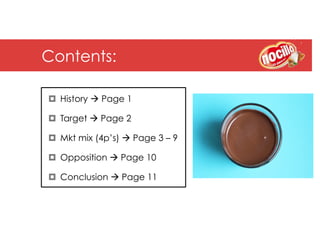 The document discusses launching the Catalan product Nocilla internationally. Nocilla was created in 1967 and is considered Spain's preferred snack brand, known for its unique taste of milk, cocoa, hazelnuts and sugar. It aims to internationalize in 2013 to increase its market share beyond Spain, where it faces competition from Nutella. The document covers Nocilla's history and target customer profile, then analyzes its marketing mix of affordable pricing, distinctive packaging, promotion through advertising and social media, and expansion of product lines. In conclusion, entering new foreign markets is seen as key to Nocilla's continued growth.