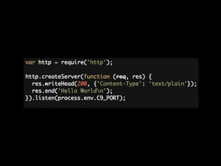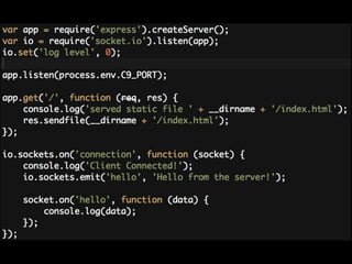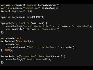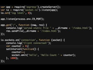 Node.js is a platform that enables building real-time web applications using JavaScript. It allows for non-blocking I/O which makes it well-suited for real-time applications like Twitter and Facebook that deliver information to users as soon as it is published. Node.js uses an event-driven, non-blocking I/O model that makes it lightweight and efficient for data-intensive real-time applications compared to other frameworks. Socket.IO is a library that simplifies real-time communication with WebSockets in Node.js applications.