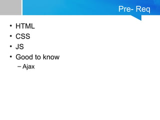 Node.js is a JavaScript runtime environment that allows JavaScript to be run on the server-side. It has prerequisites of HTML, CSS and JavaScript knowledge. Good background includes familiarity with Ajax techniques. To get started, Node.js must be installed on your development environment.