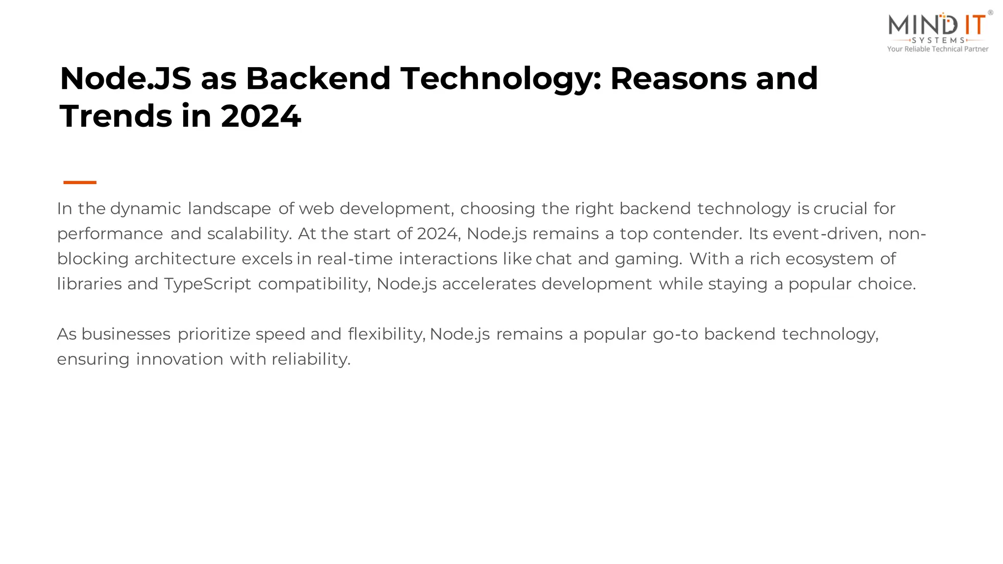 As of 2024, Node.js is a leading backend technology due to its event-driven architecture, scalability, and rich ecosystem, making it suitable for real-time applications and cloud integration. Key trends impacting Node.js include the rise of serverless architecture, enhanced microservices, and increased adoption of TypeScript, while it also integrates well with technologies like GraphQL and supports machine learning applications. Overall, Node.js continues to thrive as a favored choice for efficient and innovative web development.
