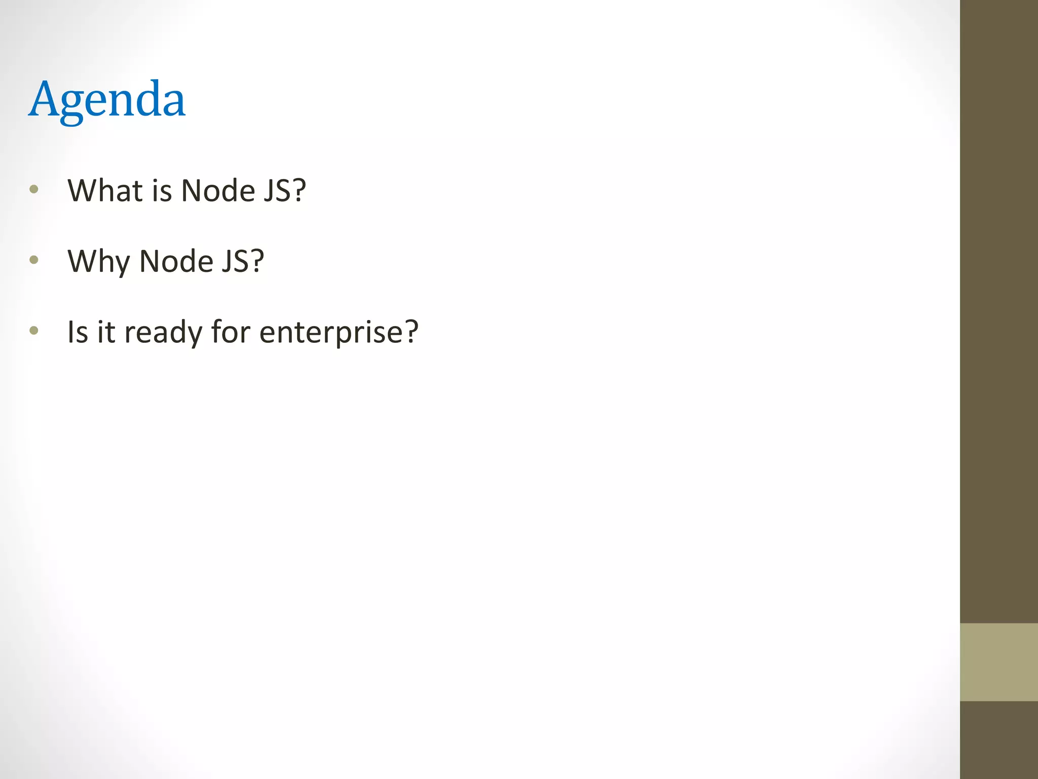 The document discusses Node.js, including what it is, its benefits, use cases, and readiness for enterprise use. Node.js is an event-driven, non-blocking I/O model that is well-suited for building scalable web applications with real-time features but not CPU-intensive batch processes. It promotes fast development with smaller codebases and is widely adopted by enterprises. The document also covers Node.js application architecture, database support, development tools, deployment practices, and strategies for adoption.