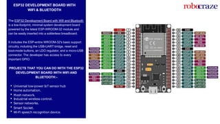 The document provides an overview of the ESP32 development board, highlighting its features like Wi-Fi and Bluetooth capabilities, integration with a solderless breadboard, and various projects it can be used for, such as IoT sensor hubs and home automation. It also discusses the Amica Node MCU ESP8266 module, emphasizing its programmability and applications in wireless projects. Both boards serve as versatile platforms for developing diverse Internet-connected devices.