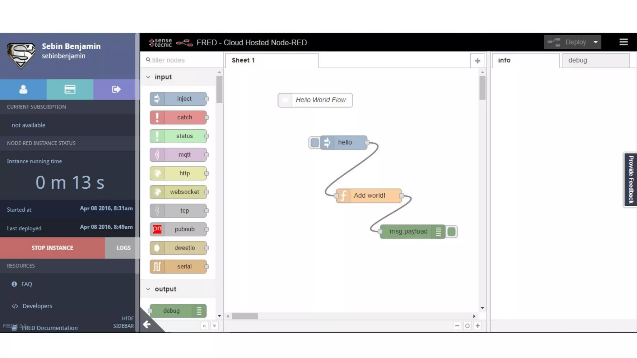The document discusses the Internet of Things (IoT) and the use of Node-RED for developing IoT applications, emphasizing the potential of smart objects to collect and exchange data. It outlines the advantages of using Node-RED's visual programming approach for wiring together hardware, APIs, and online services, as well as its installation and flow creation processes. Additionally, it provides a sample flow to illustrate the practical use of Node-RED and how to share flows using JSON format.